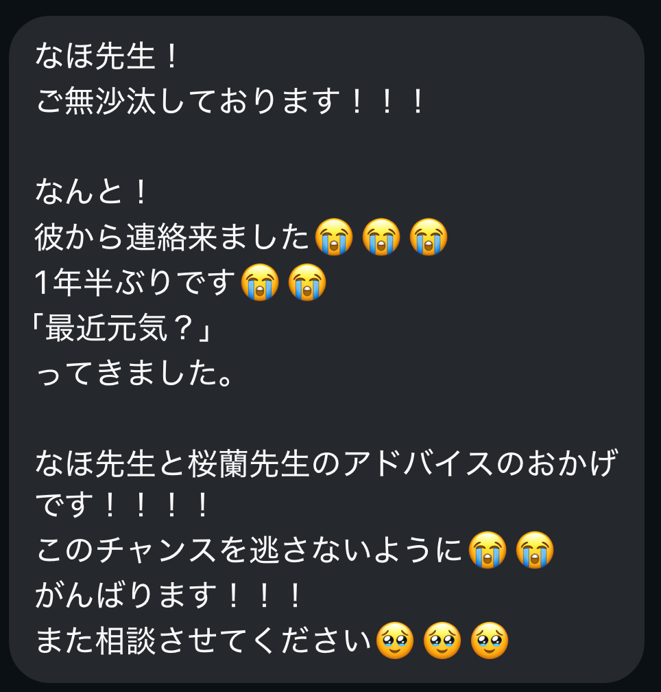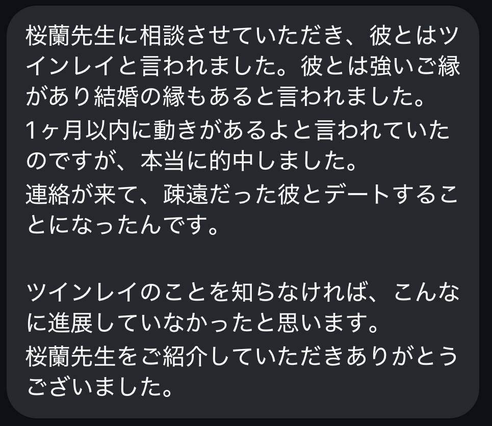 4年ほど音信不通の彼のことを桜蘭先生に相談しました。すると彼と私がツインレイだということがわかりビックリ。確かに思い当たる節が多々あり…音信不通はサイレント期間でした。先生は「でも大丈夫。今年でもう終わりです」言っていましたが、「いや、4年も音信不通だったのにさすがに…」と半信半疑でした。でも先日、先生に相談した約1週間後になんと彼から連絡が来たんです!驚きすぎて、連絡が来た瞬間叫びました。